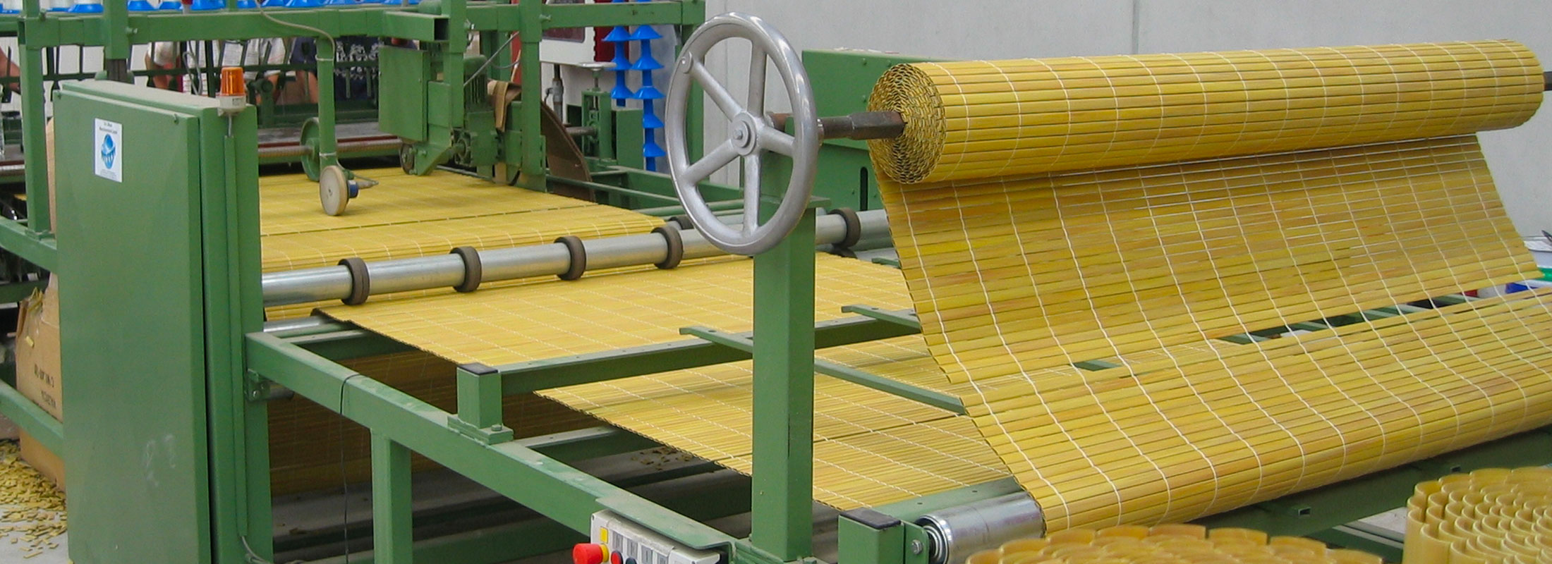 Mit der Sichtschutzmattenmaschine können einzelne Natur- oder Kunststoffstäbe zu Matten verarbeitet werden, die als Sichtschutz oder zur Beschattung dienen. Die Profile werden einzeln versteppt und verklebt.